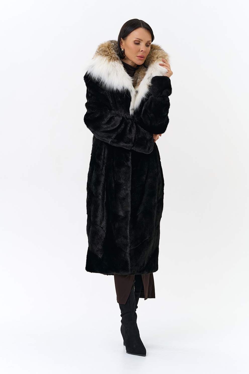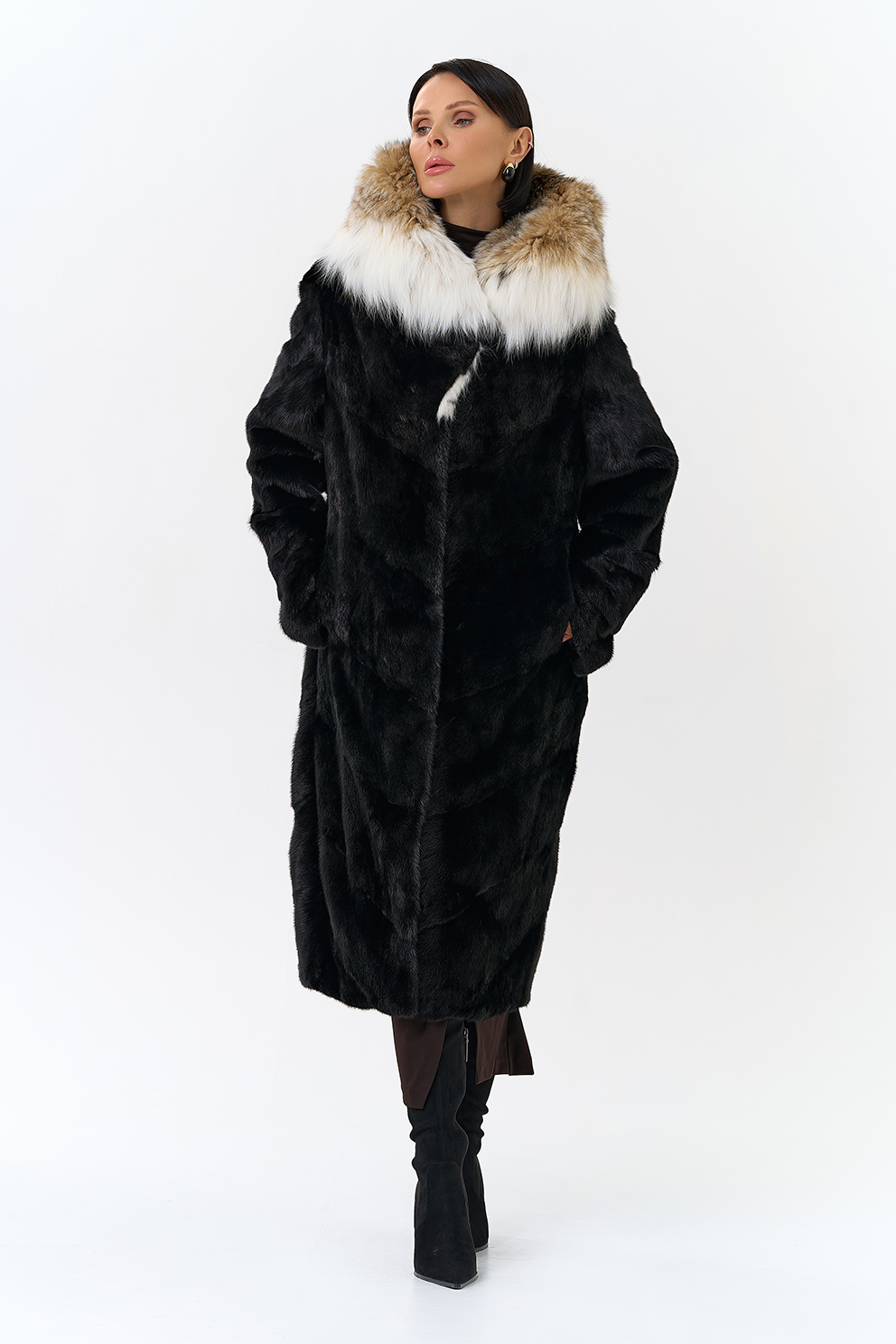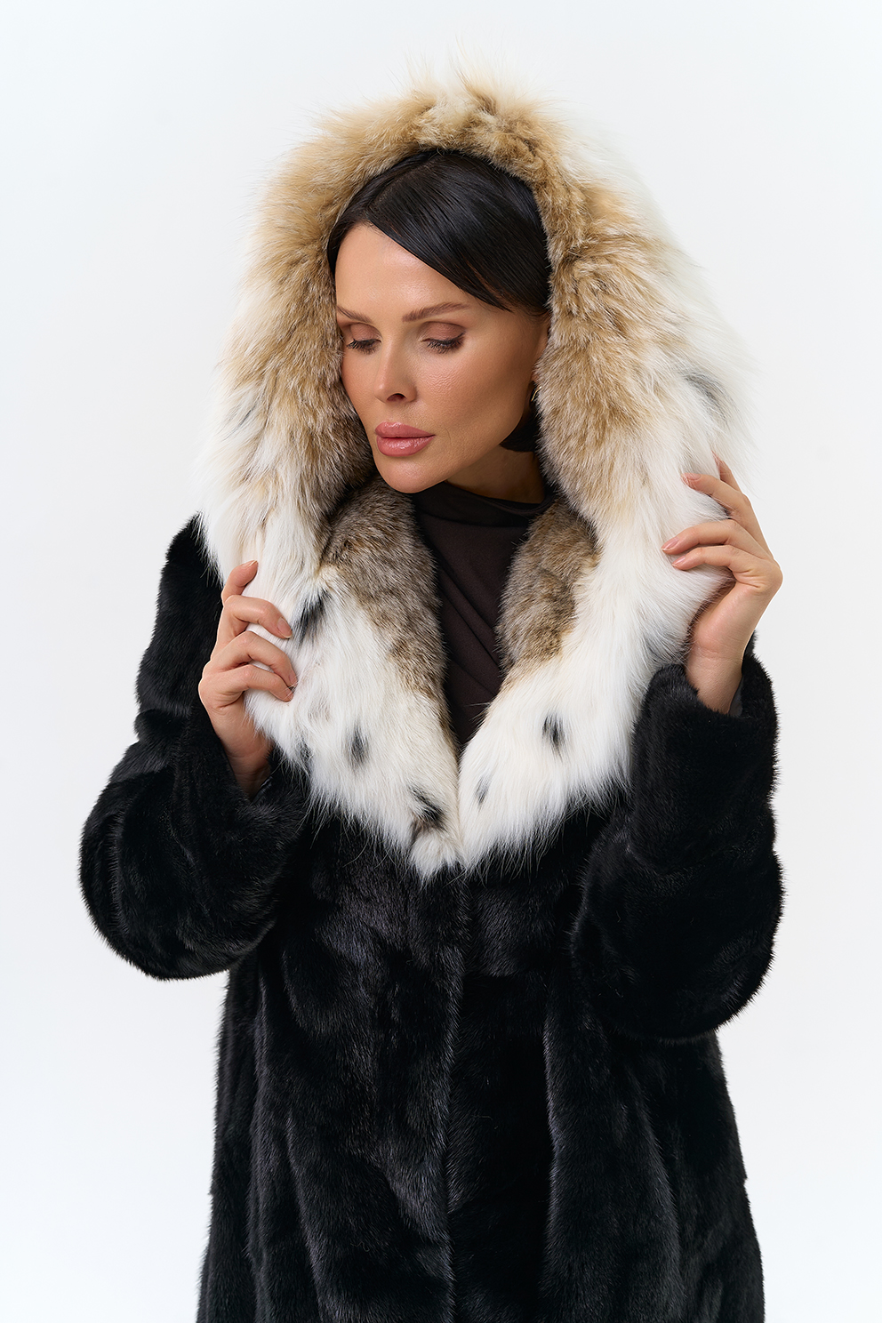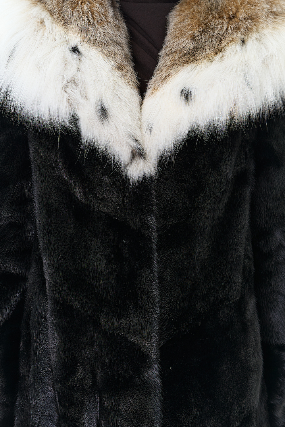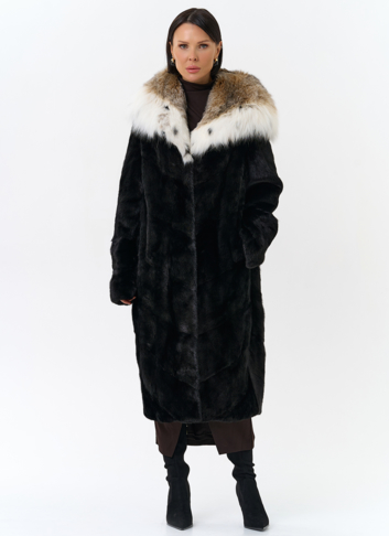 Модель украшает капюшон с отделкой из меха рыси. Мех норки черного цвета