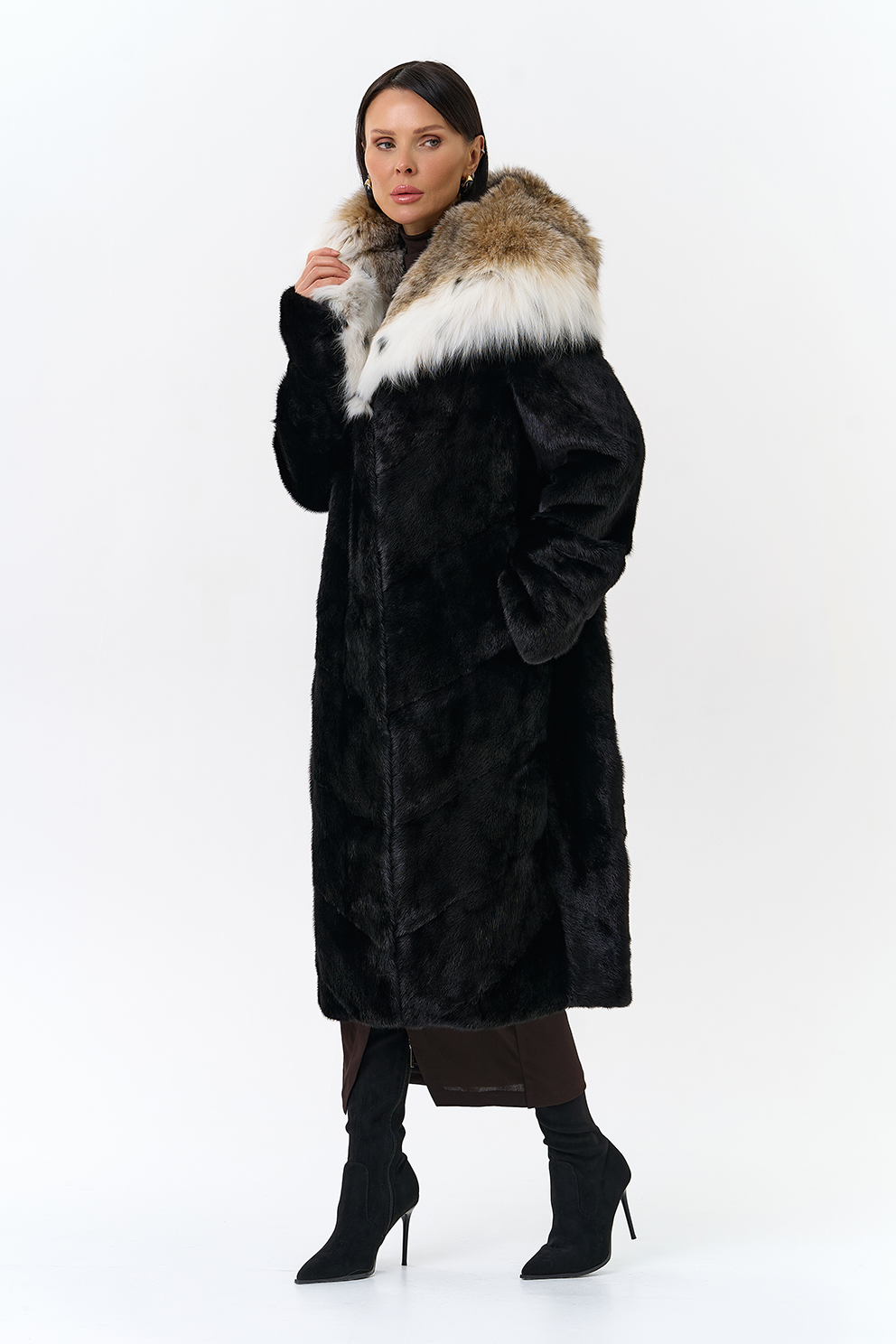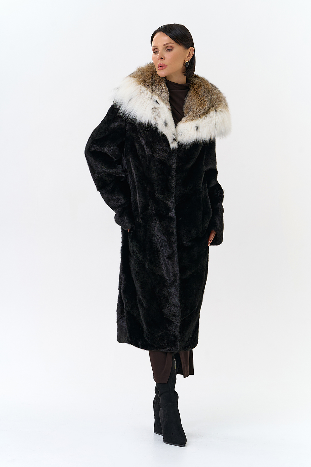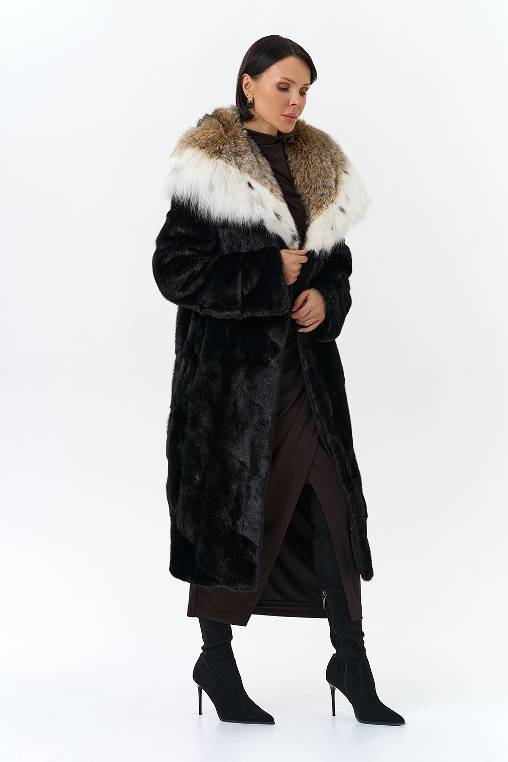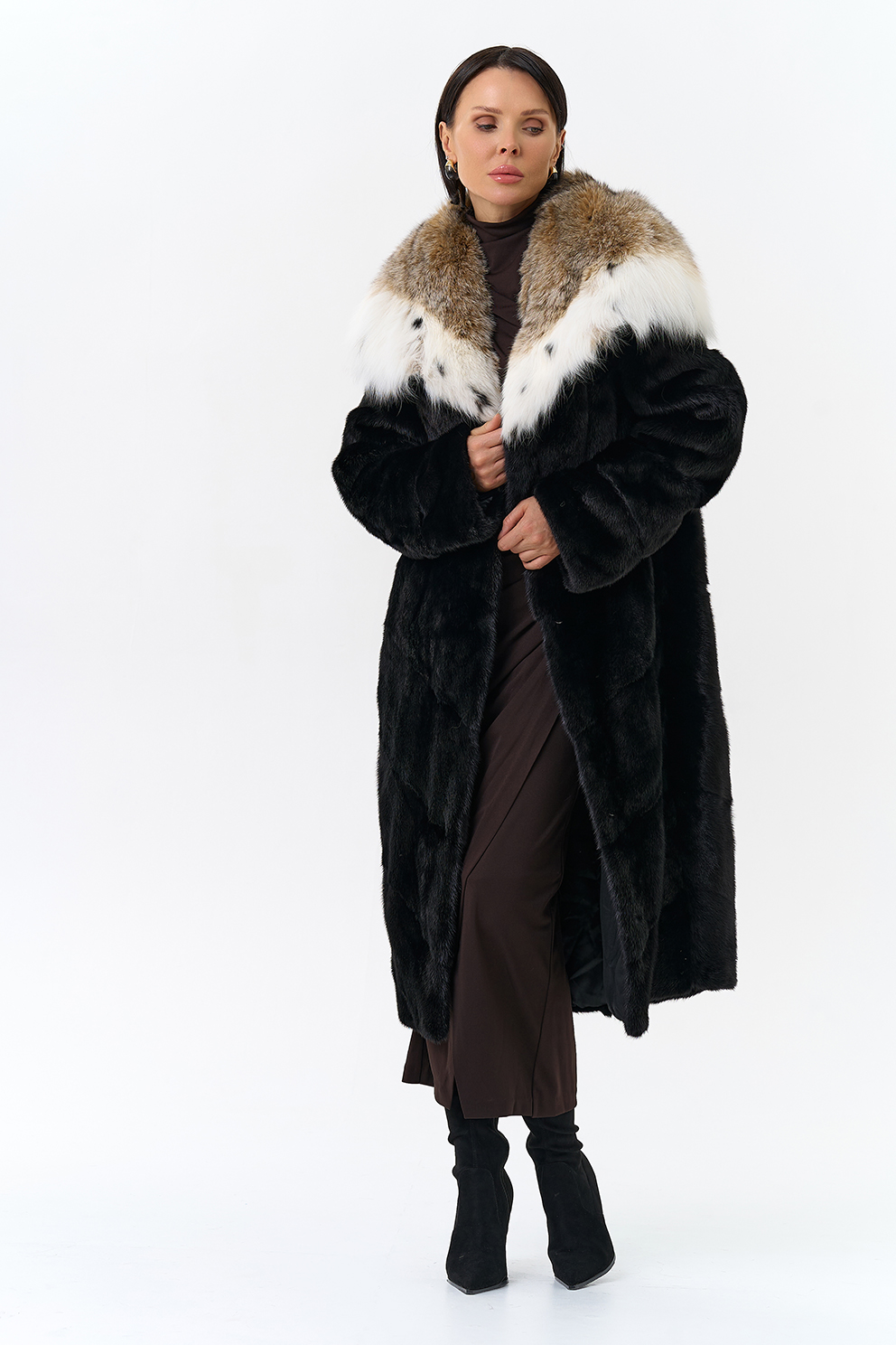 Модель украшает капюшон с отделкой из меха рыси. Мех норки черного цвета