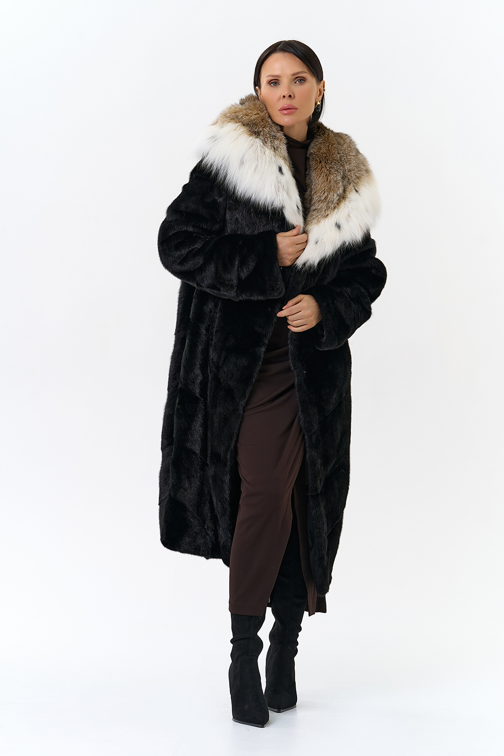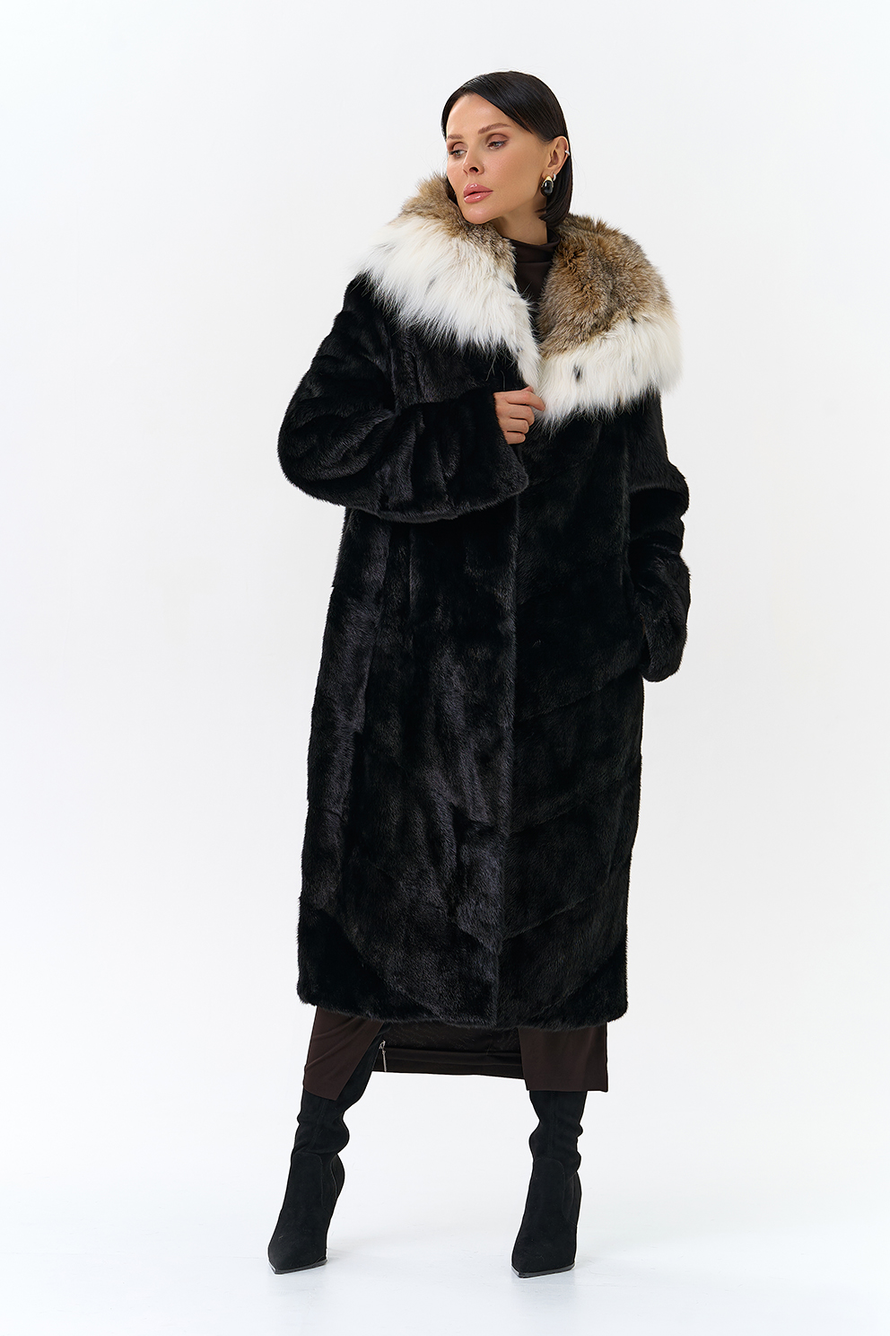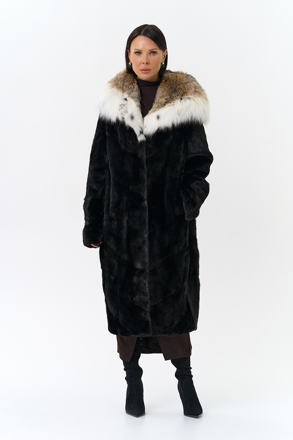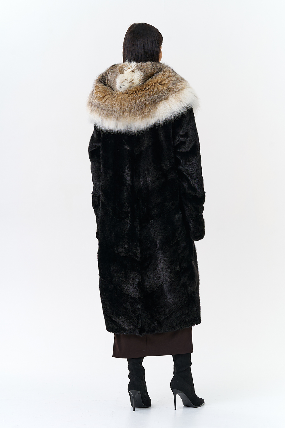 Модель украшает капюшон с отделкой из меха рыси. Мех норки черного цвета