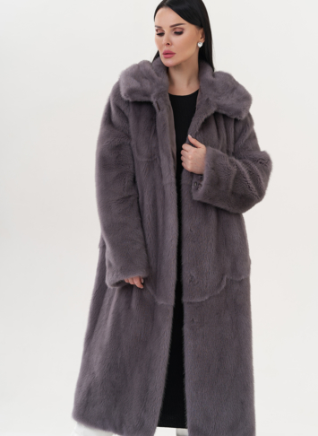 Норковая шуба с капюшоном в фиолетовом цвете.